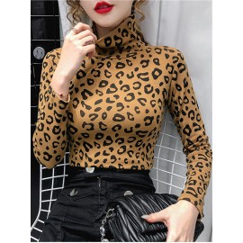 Women's T-shirt Slim Fit Long Sleeve Turtle Neck Leopard Modest Top